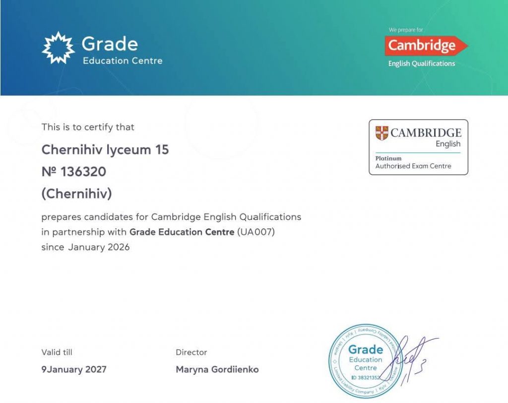Чернігівський ліцей №15 розширює міжнародну співпрацю та підвищує стандарти мовної освіти. Наш заклад став офіційним партнером GRADE UA з підготовки до міжнародних іспитів Cambridge exams, отримавши відповідну ліцензію, а також партнером міжнародного екзаменаційного центру Pearson з підготовки та прийняття іспитів з англійської мови.